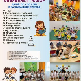 Центр развития детей «Genius Land» объявляет набор детей от 4 до 7 лет в развивающие группы! У нас: 1. Веселый английский 2. Ментальная арифметика 3. Подготовка к школе 4. Раннее чтение 5. Познавайка 6. Нейробика 7. Школа маленького художника 8. Футбол 9. Игры Дыгына 10. Хореография 11. Шашки 12. Детский фитнес Почему выбирают нас? • опытные педагоги; • авторские методики; • весело + полезно = результат; • современные