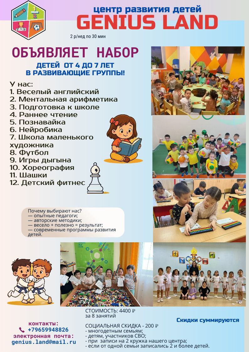Центр развития детей «Genius Land» объявляет набор детей от 4 до 7 лет в развивающие группы!